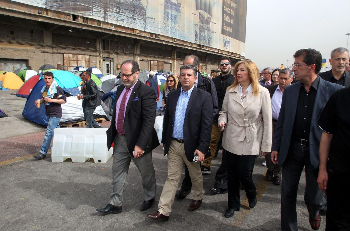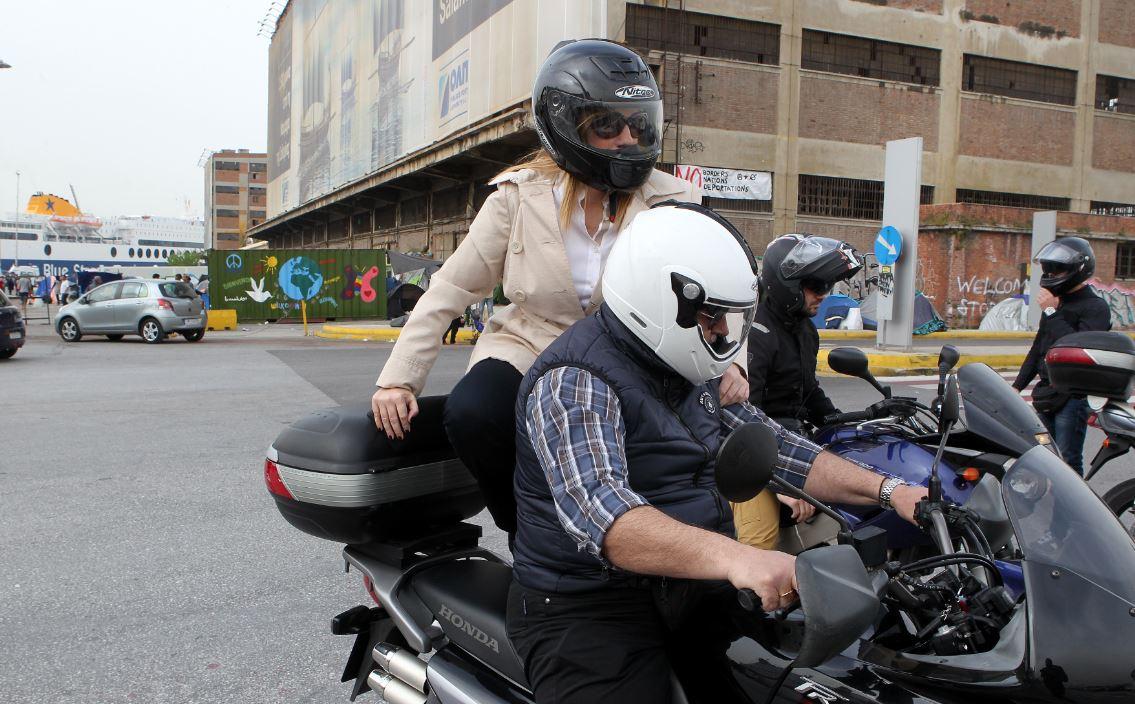 Η Φ. Γεννηματά έφτασε στην προβλήτα Ε2 πάνω σε μια μηχανή, φορώντας το κράνος της.