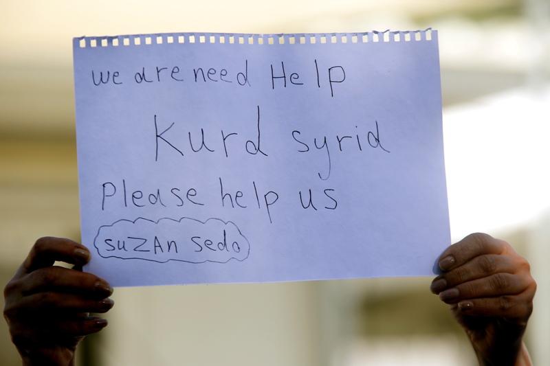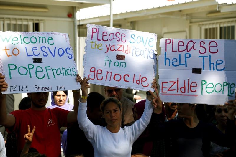 «Είμαστε και εμείς άνθρωποι», «Ο Πάπας είναι η ελπίδα μας», είναι μερικά από τα μηνύματα που αναγράφονται στα πλακάτ που κρατούν στα χέρια τους, ενώ άλλα κάνουν αναφορά στο Κομπάνι και το κουρδικό.