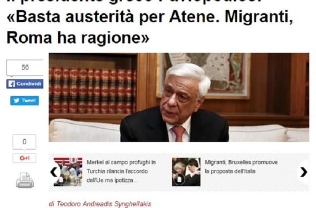 Οσον αφορά την πρόταση του Ιταλού πρωθυπουργού Ματέο Ρέντσι για χρηματοδότηση των αφρικανικών χωρών -ζητώντας σε αντάλλαγμα ουσιαστική φύλαξη των συνόρων τους – ο Πρόεδρος της Δημοκρατίας την κρίνει «εξαιρετικά ενδιαφέρουσα και ρεαλιστική». Μια πρόταση, η οποία «κινείται μέσα στην όλη λογική του Ευρωπαϊκού Συμφώνου για την Μετανάστευση και το Άσυλο, του 2008».