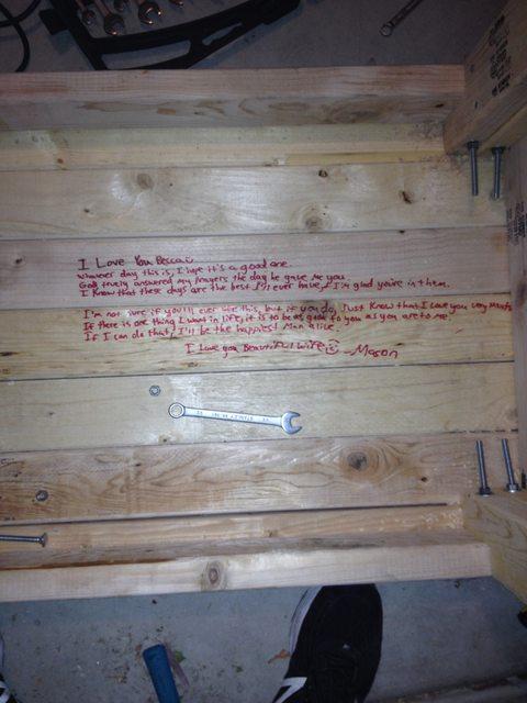 Ο χρήστης ανήρτησε φωτογραφία από το σκαλισμένο σημείωμα για την οποία έγραψε: «Βρήκα ένα σημείωμα από τον πατέρα μου στη μητέρα μου όταν κατακερμάτισα τον παλιό πάγκο της. Ο πατέρα μου πέθανε στις 26 Φεβρουαρίου, στην ηλικία των 51 ετών, από ρήξη αρτηρίας. Έφτιαξε αυτόν τον πάγκο για τη μητέρα μου όταν εκείνη ασχολήθηκε με την χάραξη μετάλλων».
