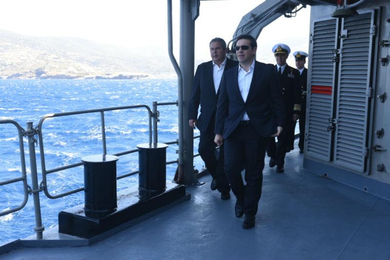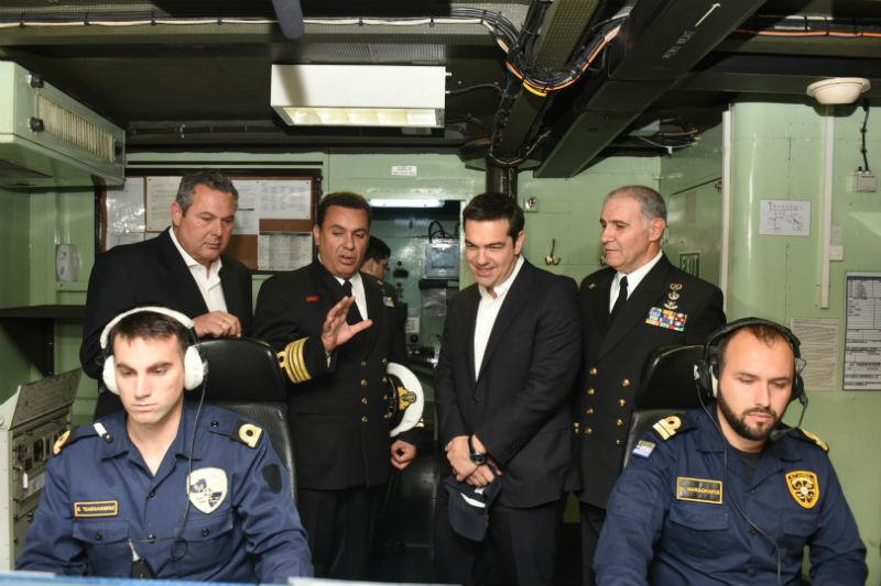Νωρίτερα ο κ. Τσίπρας μαζί με τον υπουργό Εθνικής Άμυνας Πάνο Καμμένο αντάλλαξαν ευχές και τήρησαν το έθιμο της Λαμπρής τσουγκρίζοντας κόκκινα αυγά με τους αξιωματικούς και το πλήρωμα. Αλέξης Τσίπρας και Πάνος Καμμένος παρακολούθησαν το σούβλισμα του οβελία στο κατάστρωμα συνομίλησαν με αξιωματικούς, υπαξιωματικούς και ναύτες, ενώ επισκέφθηκαν και τη γέφυρα και το κέντρο επιχειρήσεων του πλοίου όπου ενημερώθηκαν από τον κυβερνήτη. Ο πρωθυπουργός συνομίλησε με τον κυβερνήτη του πλοίου, το οποίο βρισκόταν εν πλω σε αποστολή.