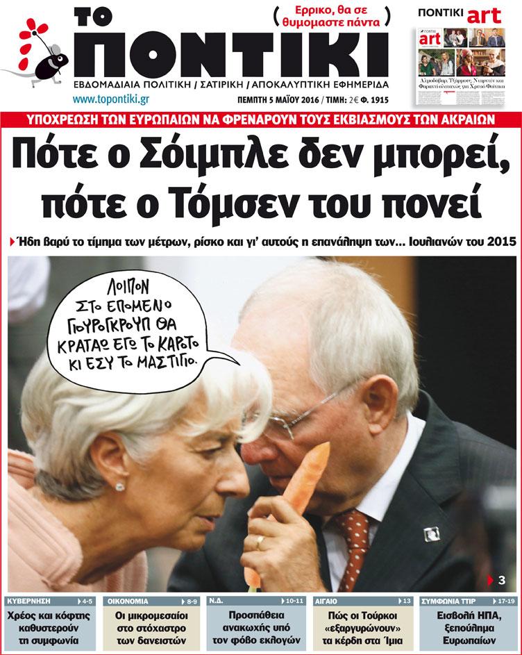 Το «Ποντίκι» κυκλοφορεί την Πέμπτη, 5 Μαΐου 2016 με πρωτοσέλιδο τίτλο «Πότε ο Σόιμπλε δεν μπορεί, πότε ο Τόμσεν του πονεί» και αναλυτικό – αποκαλυπτικό ρεπορτάζ για το βαρύ τίμημα των νέων μέτρων και την υποχρέωση των δανειστών να φρενάρουν τους εκβιασμούς των ακραίων. Ρίσκο για τους Ευρωπαίους η επανάληψη των… Ιουλιανών του 2015.