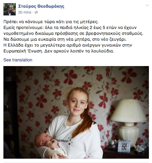 Εμείς προτείνουμε: όλα τα παιδιά ηλικίας 2 έως 5 ετών να έχουν νομοθετημένο δικαίωμα πρόσβασης σε βρεφονηπιακούς σταθμούς. Να δώσουμε μια ευκαιρία στη νέα μητέρα, στο νέο ζευγάρι.