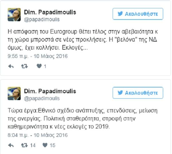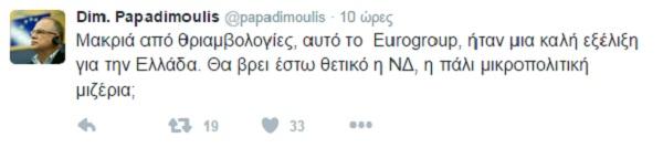 Όπως έγραψε χαρακτηριστικά ο κ.Παπαδημούλης λίγη ώρα μετά την ολοκλήρωση της συνεδρίασης του Eurogroup: “Μακριά από θριαμβολογίες, αυτό το Eurogroup, ήταν μια καλή εξέλιξη για την Ελλάδα. Θα βρει έστω θετικό η ΝΔ, η πάλι μικροπολιτική μιζέρια;”