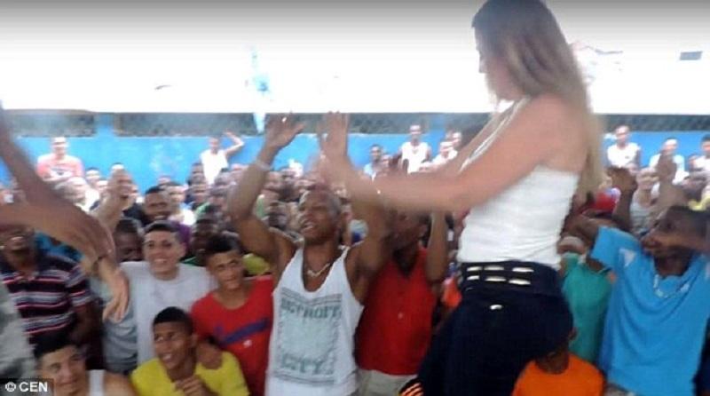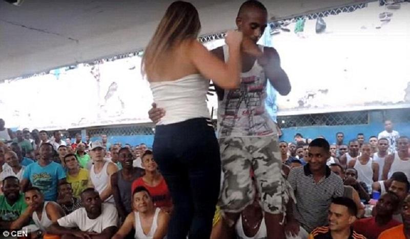 Οι φυλακισμένοι τα έχασαν. Είδαν μια ξανθιά, με ένα στενό μαύρο παντελόνι, και μια λευκή μπλούζα με τους ώμους έξω, να ανεβαίνει στην εξέδρα και να τους μιλάει. Αμέσως άρχισαν να σφυρίζουν και της ζήτησαν τον πρώτο χορό να τον χορέψει εκείνη.