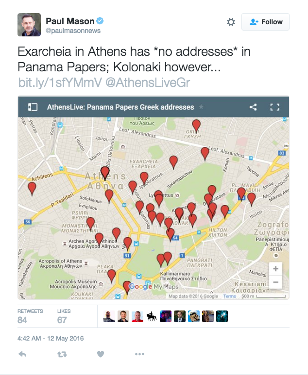 Ο δημοσιογράφος του Channel 4, Paul Mason που έχει αναπτύξει ισχυρούς δεσμούς με την Ελλάδα, ανήρτησε στον προσωπικό του λογαριασμό στο twitter έναν χάρτη του Κολωνακίου που έχει σημειωμένο τις off shore που αντιστοιχούν στην περιοχή, σύμφωνα με τα Panama Papers.
