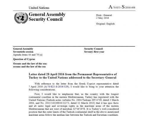 Το έγγραφο κατέθεσε ο μόνιμος αντιπρόσωπος της Τουρκίας Χαλίτ Τσεβίκ και δημοσιεύτηκε ως επίσημο έγγραφο του ΟΗΕ στις 2 Μαΐου σε απάντηση της επιστολής του κύπριου πρέσβη Νίκου Αιμιλίου ο οποίος είχε απορρίψει τις αιτιάσεις της Άγκυρας και του ψευδοκράτους που αμφισβητούσαν το δικαίωμα της Κυπριακής Δημοκρατίας να ασκήσει το κυριαρχικό δικαίωμα της για έρευνες και εκμετάλλευση των φυσικών πόρων που βρίσκονται στην ΑΟΖ της.