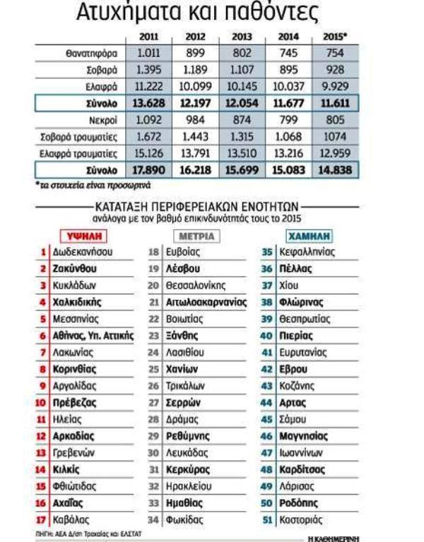Τη μεγαλύτερη αύξηση νεκρών εμφανίζει η Αθήνα με 25 θύματα περισσότερα απ’ ό,τι το 2014, η Μεσσηνία με 17, η Ζάκυνθος με 8, τα Δωδεκάνησα και το Λασίθι με 7. Τη μεγαλύτερη μείωση εμφανίζουν η Λάρισα (με 12 θύματα λιγότερα από το προηγούμενο έτος), η Καρδίτσα (-10), η Αιτωλοακαρνανία (-9) και η Μαγνησία (-7).