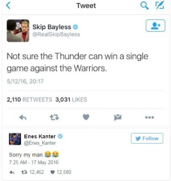 Λίγο μετά την σπουδαία νίκη των Οκλαχόμα Σίτι Θάντερ επί των Γκόλντεν Στέιτ Ουόριορς (108-102), ο Ενές Καντέρ απάντησε αφοπλιστικά σε δημοσιογράφο που αμφισβήτησε την ομάδα του.
