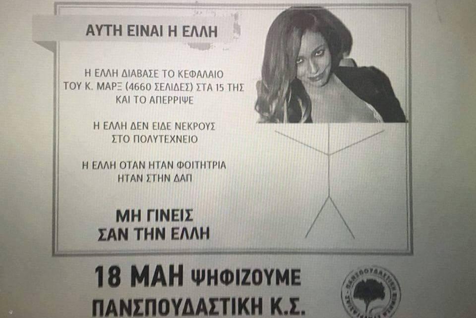 Μια από τις αφίσες που κυκλοφόρησαν για τις φοιτητικές εκλογές, ήταν και αυτή της Πανσπουδαστικής σε άγνωστη σχολή, με πρωταγωνίστρια, την δηλωμένη οπαδό της Νέας Δημοκρατίας, Έλλη Παπαγγελή.