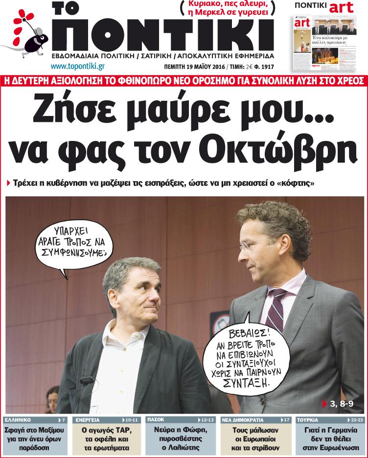 Το «Ποντίκι» κυκλοφόρησε την Πέμπτη, 19 Μαΐου 2016 με πρωτοσέλιδο τίτλο «Ζήσε μαύρε μου… να φας τον Οκτώβρη» και αναλυτικό – αποκαλυπτικό ρεπορτάζ για τον «αγώνα δρόμου» της κυβέρνησης να μαζέψει τις εισπράξεις, ώστε να μη χρειαστεί ο «κόφτης».