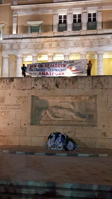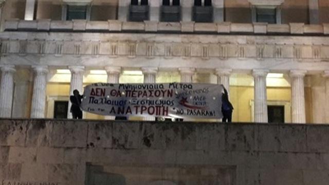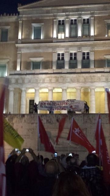 Πανό ανήρτησαν σήμερα το βράδυ στον προαύλιο χώρο της Βουλής, υπό τα συνθήματα των συγκεντρωμένων στον Άγνωστο Στρατιώτη, ο Παναγιώτης Λαφαζάνης, ο Δημήτρης Στρατούλης, ο Κώστας Ήσυχος και ο Βασίλης Πριμικήρης.