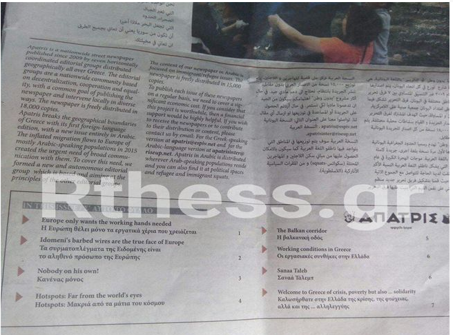 Η εφημερίδα δρόμου «Άπατρις», διανεμήθηκε από αγνώστους στους πρόσφυγες. Η 8σέλιδη «Άπατρις», που κυκλοφόρησε σε 15.000 φύλλα, καταφέρεται ενάντια στην Ευρώπη για τον τρόπο που διαχειρίζεται το προσφυγικό, μιλά για τις συνθήκες διαβίωσης στα hot spots και την αντιμετώπιση των προσφύγων από τους Έλληνες αλλά και από την ελληνική κυβέρνηση. Τα θέματα του φύλλου είναι συγκεκριμένα τα εξής, γραμμένα στα αραβικά: