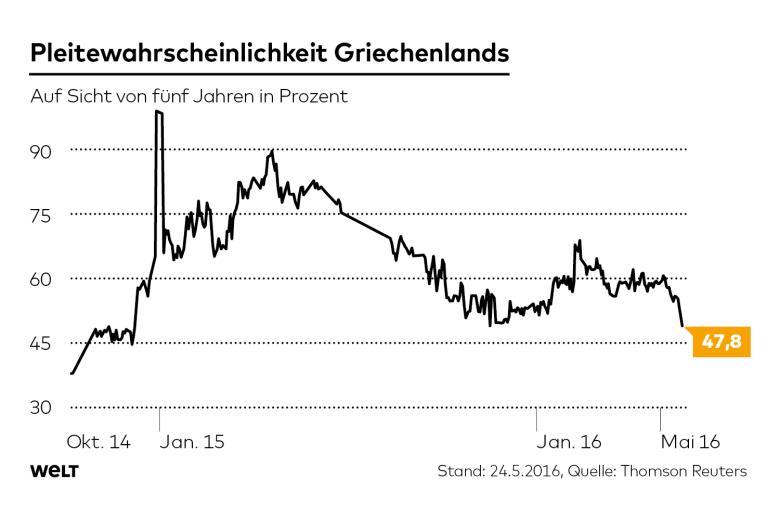 Ενα γράφημα αποκαλύπτει ότι ενόσω οι πολιτικοί διαφωνούν, οι αγορές προεξοφλούν εδώ και καιρό το κούρεμα του ελληνικού χρέους. Το επίμαχο γράφημα για την Ελλάδα αποδεικνύει ότι η Γερμανία σίγουρα θα συμφωνήσει σε ένα κούρεμα του χρέους της Ελλάδας. Στο γράφημα αυτό απεικονίζεται η πιθανότητα πτώχευσης της Ελλάδας η οποία βρίσκεται κάτω από το 50%. Οι παίκτες εκτιμούν ότι ο κίνδυνος να πτωχεύσει η Ελλάδα στα επόμενα 5 χρόνια είναι 47%. Πρόκειται, δηλαδή, για το χαμηλότερο επίπεδο από το Δεκέμβριο του 2014.
