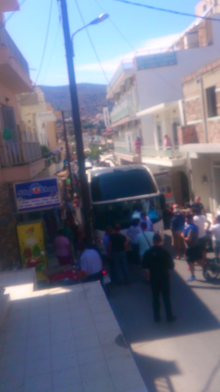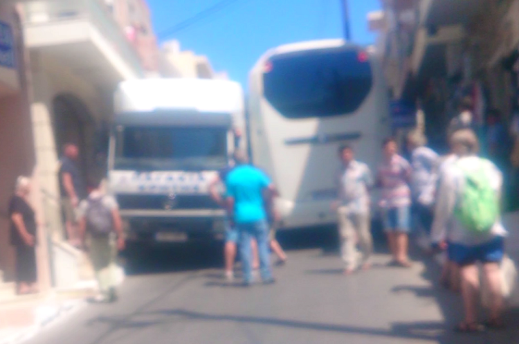 Ένα πρωτοφανές περιστατικό σημειώθηκε, το μεσημέρι της Δευτέρας, στην πλέον τουριστική περιοχή της Κρήτης, την Ελούντα.Ένα τουριστικό λεωφορείο που επιχειρούσε να «ανέβει» την οδό Παπανδρέου, μετά την πλατεία της Ελούντας, «σφήνωσε» όταν διασταυρώθηκε με αντιθέτως διερχόμενο ημιφορτηγό.