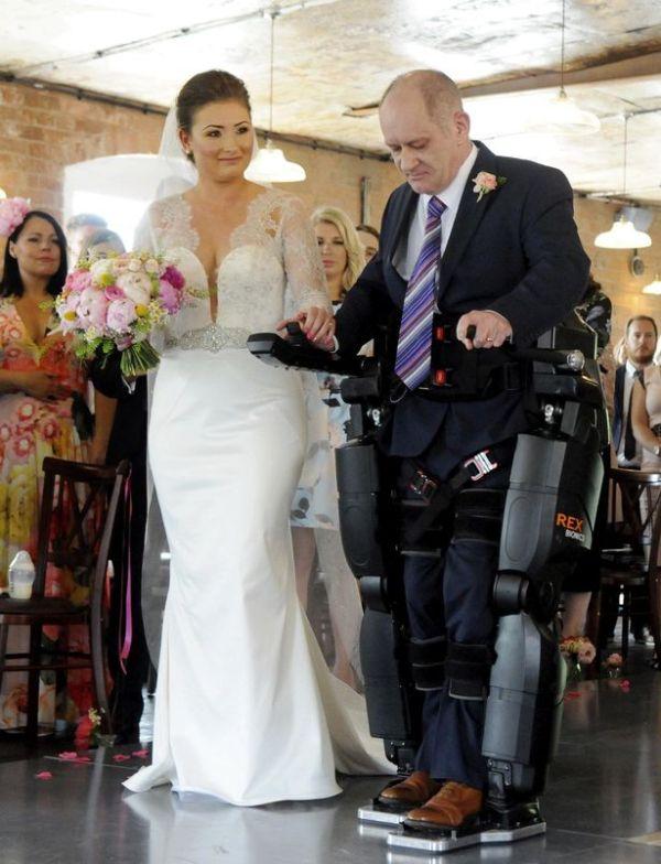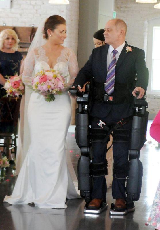 Πράγματι, η εταιρία Rex Bionics έδωσε τη βοήθειά της στην κοπέλα και στον πατέρα της δίνοντας την αξίας 118.000 ευρώ βιονική στολή στον 58χρονο Κρις και παράλληλα εκπαίδευσε τον Κρις να χρησιμοποιεί την στολή.Έτσι, ο Κρις κατάφερε να συνοδεύσει όρθιος και υπερήφανος την Χέδερ στην εκκλησία και την παρέδωσε στον 28χρονο γαμπρό.