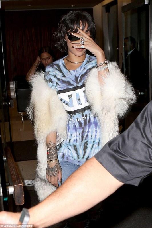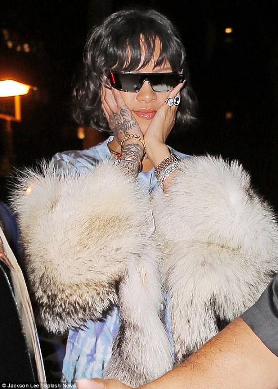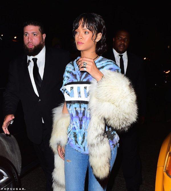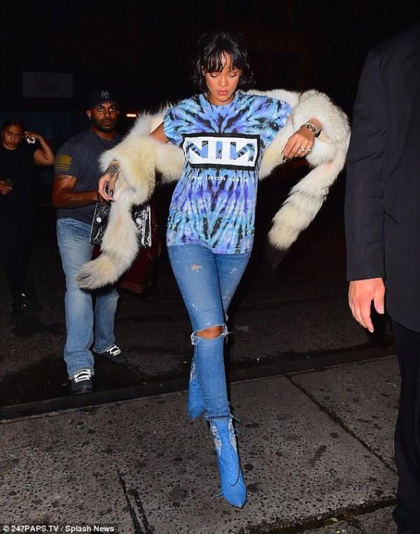 Η Rihanna, με ροκ εμφάνιση, σκισμένο τζιν και ξεβαμμένη γαλάζια μπλούζα, συνόδεψε την εμφάνιση αυτή με μια γούνα chinchilla. Τα εντυπωσιακά, γαλάζια Manolo Blahnik μποτάκια της, ήταν εκείνα που τράβηξαν τα βλέμματα.