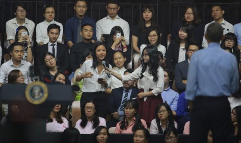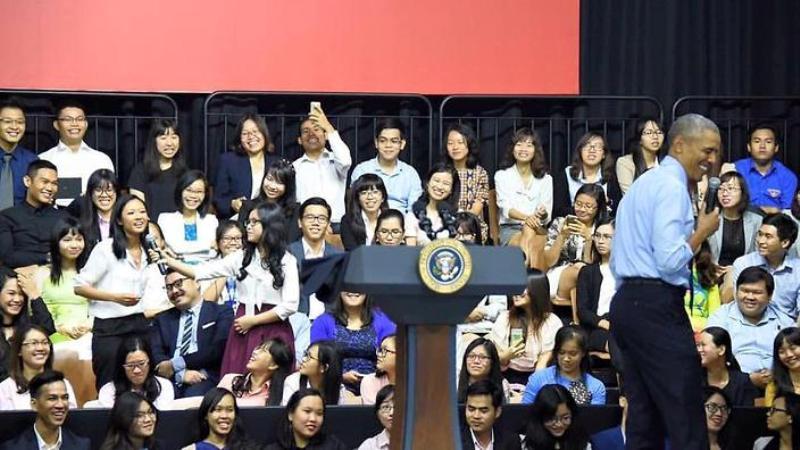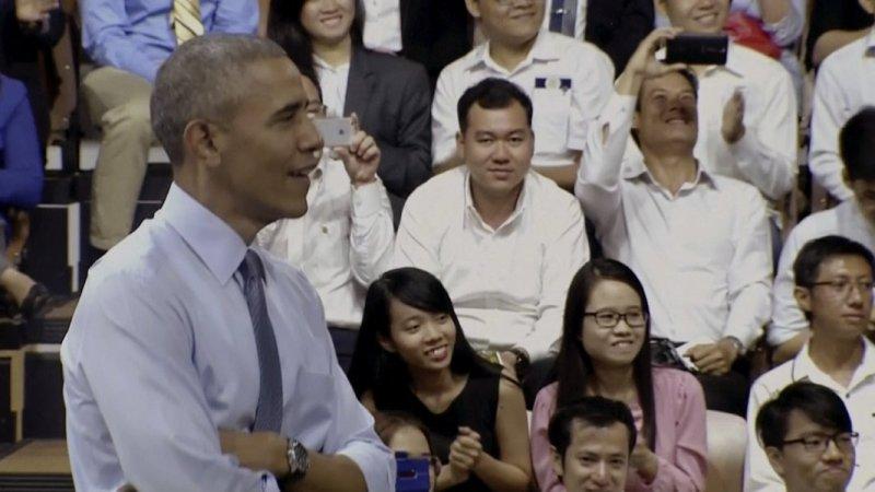Αυτή τη φορά δεν ήταν σε κάποια εκπομπή αλλά στο Δημαρχείο της πόλης Ho Chi Minh όπου πλήθος κόσμου περίμενε για να συνομιλήσει μαζί με τον Αμερικανό Πρόεδρο και να ανταλλάξει μαζί του απόψεις περί πολιτικής.