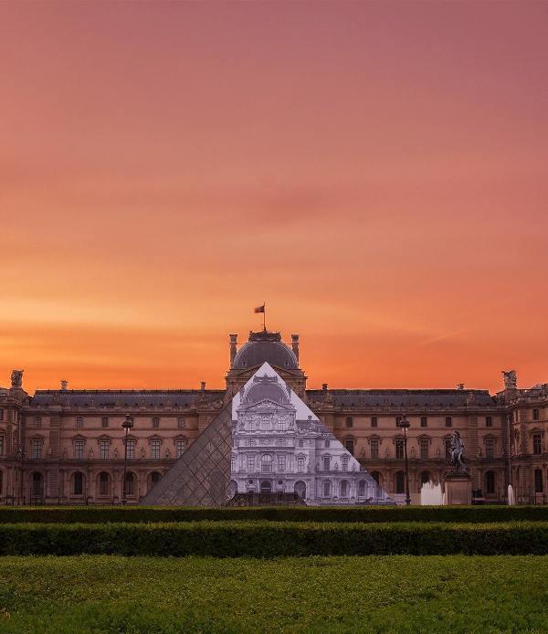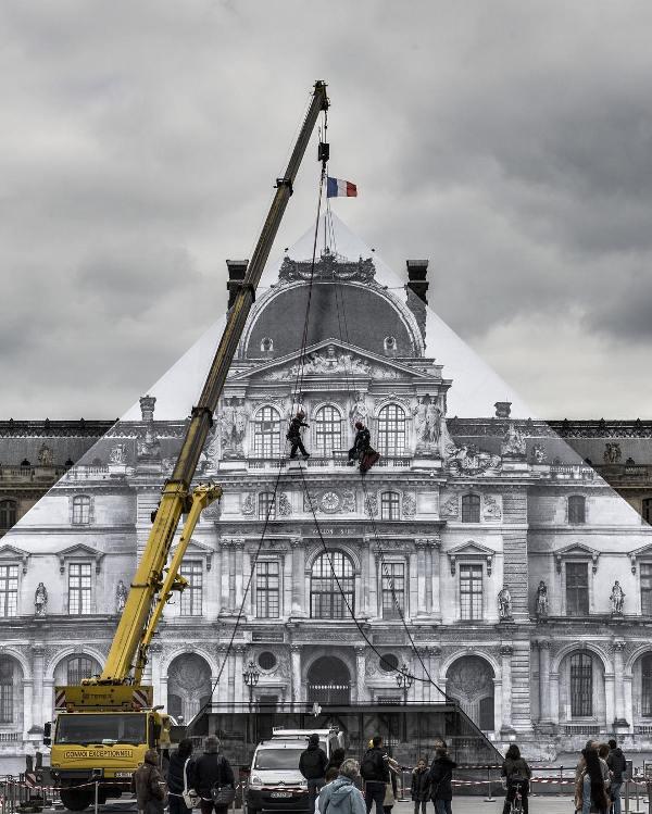 Κάλυψε, λοιπόν, την περίφημη υάλινη πυραμίδα του διάσημου αμερικανού αρχιτέκτονα Ieoh Μing Pei, που είναι μπροστά στην είσοδο του εμβληματικού μουσείου, με αναμορφωτικές φωτογραφίες του ίδιου του κτιρίου. Η πυραμίδα, προσωρινά, «εξαφανίστηκε».