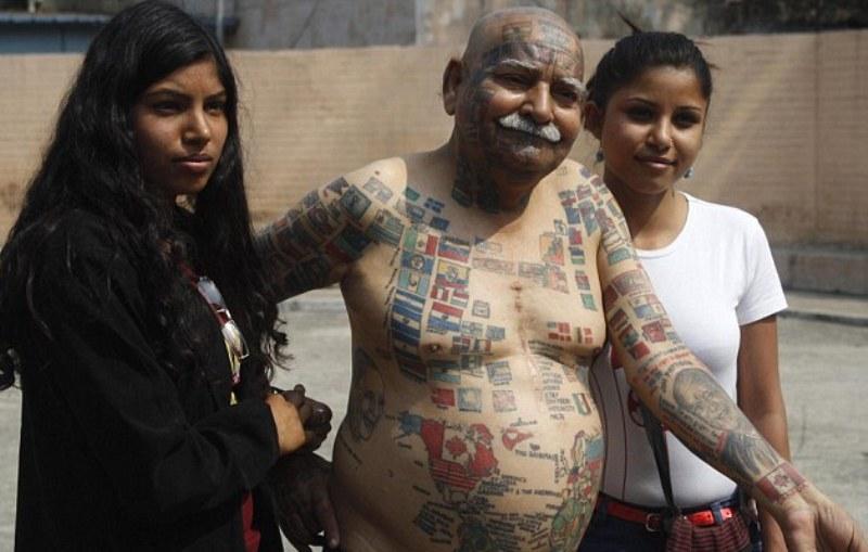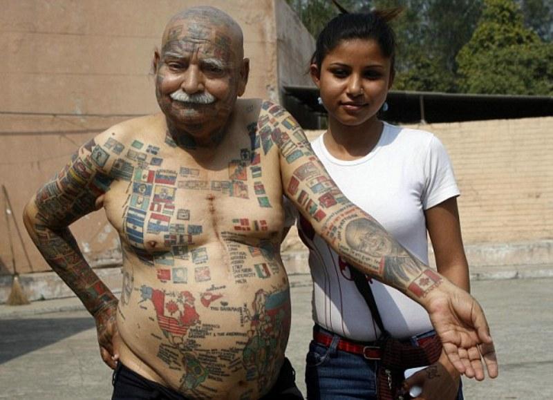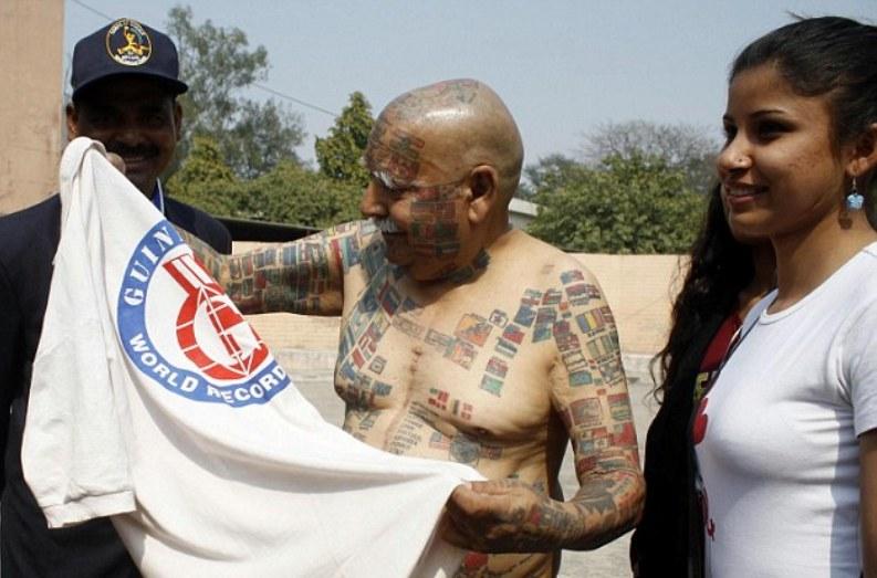 Ο Ινδός Παρκάς Ρισχί είναι 74 χρονών και έχει εμμονή με τα Ρεκόρ Γκίνες και την κατάρριψή τους. Ο Παρκάς φέρει στο σώμα του 366 τατουάζ με σημαίες από όλο τον κόσμο ενώ πρόσφατα αφαίρεσε τα δόντια του ώστε να μπορεί να «χωρέσει» 50 κεριά στο στόμα του. Ο 74χρονος δείχνει τα τατουάζ που έχει σε όλο του το σώμα με περιφάνεια στον φωτογραφικό φακό.