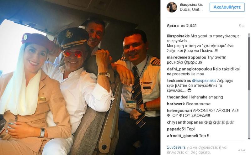 Ο ίδιος ανέβασε φωτογραφία στο Instagram μέσα από το πιλοτήριο με μέλη του πληρώματος, αφού πρώτα «προσγείωσε» το αεροπλάνο γνωστής αεροπορικής εταιρείας, γράφοντας με χιούμορ: “Mια χαρά το προσγειώσαμε το εργαλείο. Μια μικρή στάση να “χτυπήσουμε” έναν Σεϊχη και βουρ για Πεκίνο”.