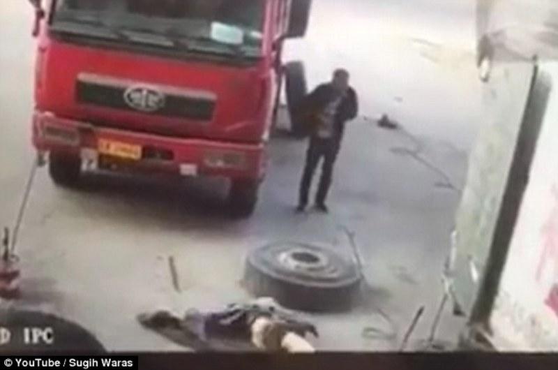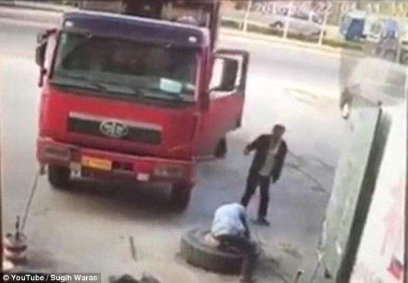 Μάλιστα ήταν τόσο ισχυρή η έκρηξη του ελαστικού που το καουτσούκ χτύπησε τον άνδρα σαν να τον χτυπούσαν θραύσματα βόμβας, ενώ από την πίεση τα μπουλόνια στις ζάντες εκσφενδονίστηκαν σε μεγάλη απόσταση δίχως να πετύχουν κανέναν, ευτυχώς.