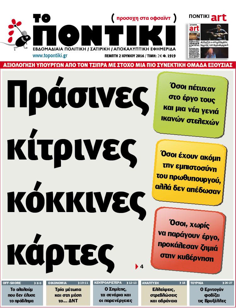 Το «Ποντίκι» κυκλοφορεί την Πέμπτη, 2 Ιουνίου 2016 με πρωτοσέλιδο τίτλο «Πράσινες, κίτρινες, κόκκινες κάρτες» και αναλυτικό – αποκαλυπτικό ρεπορτάζ για την αξιολόγηση των υπουργών από τον Τσίπρα με στόχο μια πιο συνεκτική κυβερνητική ομάδα.