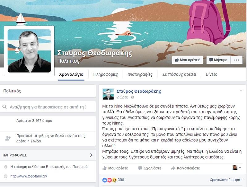 Ο Σταύρος Θεοδωράκης έγραψε στο facebook: «Με το Νίκο Νικολόπουλο δε με συνδέει τίποτα. Αντιθέτως μας χωρίζουν πολλά. Θα ήθελα όμως να εξάρω την πρόθεσή του και της γυναίκας του Αναστασίας να δωρίσουν τα όργανα της πανέμορφης κόρης τους Νίκης.