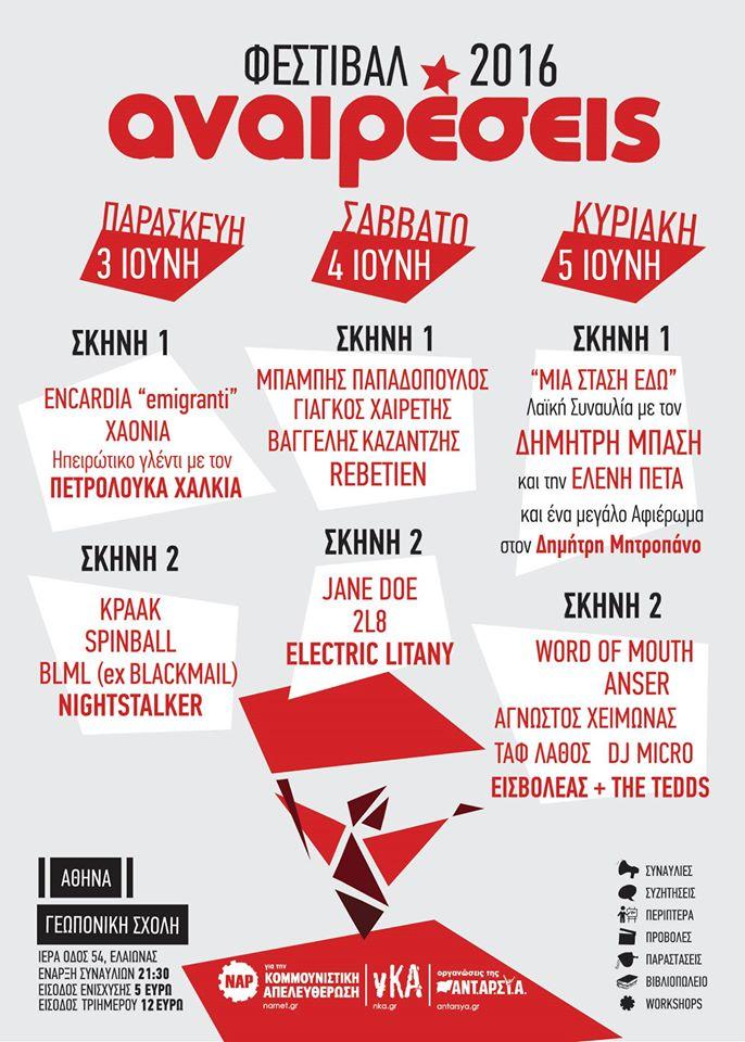 Ξεκινά το απόγευμα της Παρασκευής το πολιτικό-πολιτιστικό φεστιβάλ «Αναιρέσεις», που διοργανώνουν το Νέο Αριστερό Ρεύμα και η Νεολαία Κομμουνιστική Απελευθέρωση, οργανώσεις που συμμετέχουν στην ΑΝΤΑΡΣΥΑ.