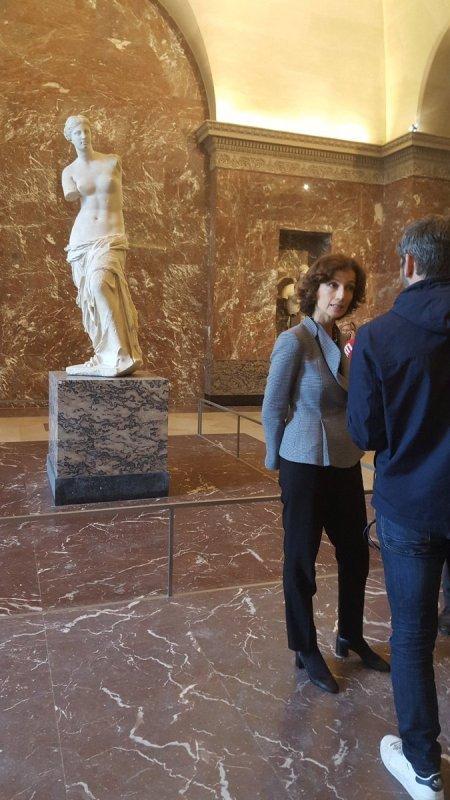Εδώ, η Υπουργός Πολιτισμού, κάνει δηλώσεις μπροστά από το μαρμάρινο Άγαλμα της Αφροδίτης της Μήλου, έργο ελληνιστικής περιόδου.