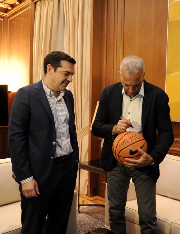 Ο πρωθυπουργός έλαβε ως δώρο μια υπογεγραμμένη μπάλα του μπάσκετ από τον θρύλο Νίκο Γκάλη και αμέσως απέδειξε την υψηλή τεχνική του με την “πορτοκαλί θεά”.