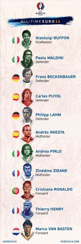 Σε μία λαμπρή εκδήλωση που έλαβε χώρα στο Παρίσι το απόγευμα της Τρίτης, η UEFA έκανε γνωστούς τους 11 παίκτες που επέλεξε ο κόσμος μέσα από ψηφοφορία της για να είναι τα μέλη της καλύτερης ενδεκάδας όλων των εποχών του Euro, με τις αντίστοιχες φιγούρες τους να απεικονίζονται πλέον μέσα από γκράφιτι στη γαλλική πρωτεύουσα.
