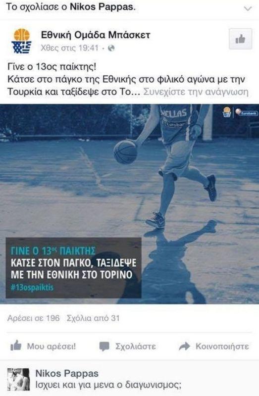 Ο γκαρντ του Παναθηναϊκού, γνωστός για το καυστικό του χιούμορ, απάντησε αυτοσαρκαστικά σε δημοσίευση της Εθνικής Ομάδας στο Facebook η οποία καλούσε τον κόσμο να γίνει ο 13ος παίκτης της ομάδας. Συγκεκριμένα ρώτησε αν «ισχύει και για μένα ο διαγωνισμός;».