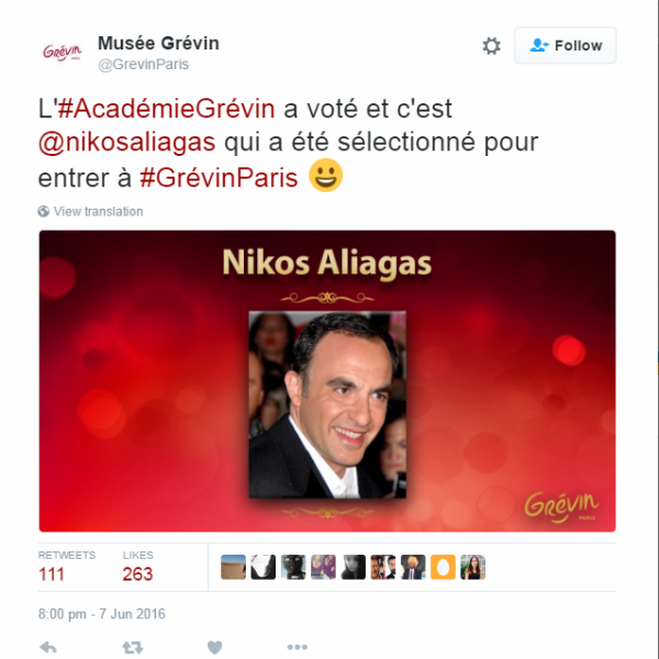 Η επιλογή του Νίκου Αλιάγα δεν έγινε τυχαία. Προέκυψε μετά από ψηφοφορία στην οποία κλήθηκαν να συμμετάσχουν οι επισκέπτες του μουσείου. Ο παρουσιαστής σχολίασε την είδηση μέσω twitter γράφοντας: «GrevinParis, είναι τιμή μου και είμαι ενθουσιασμένος που θα βρίσκομαι στο Μουσείο σας».