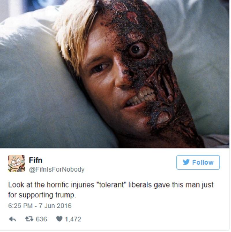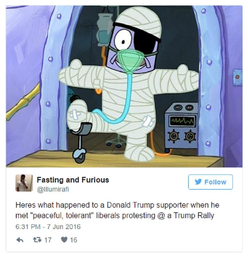 Δημοσίευσαν τη φωτογραφία μιας ηθοποιού από τα γυρίσματα της ταινίας «Ash vs Evil Dead» και παρουσίασαν τα «τραύματα» της ως αποτέλεσμα επίθεσης από μέλη των Δημοκρατικών. Η προσπάθεια τους ήταν τόσο ατελής που στο κάτω μέρος της φωτογραφίας διακρίνεται και η προέλευση της.