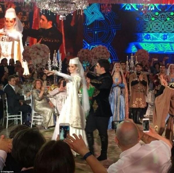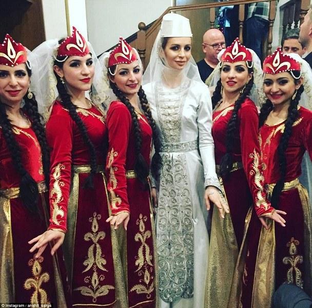 Για τις επίσημες φωτογραφίες, η νύφη φόρεσε ένα εκπληκτικό δαντελένιο φόρεμα της Alessandra Rich, με μακριά ουρά που απλωνόταν με χάρη στο πάτωμα. Χορευτές παραδοσιακών χορών από την Αρμενία και τη Γεωργία κλήθηκαν για να διασκεδάσουν τους καλεσμένους και φυσικά να δείξουν τους παραδοσιακούς χορούς από τον τόπο καταγωγής της νύφης και του γαμπρού.
