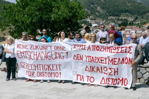 Στη μετάβαση προς το μνημείο των πεσόντων πορεύτηκαν με το πανό των Γερμανών Ακτιβιστών “ΑΚ Δίστομο”, που ενεργοποιούνται για την εκτέλεση της δικαστικής απόφασης, με την οποία δικαιώνονται τα θύματα του Διστόμου και υποχρεώνεται το γερμανικό κράτος να καταβάλει τις οφειλόμενες αποζημιώσεις.