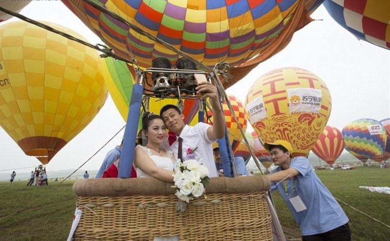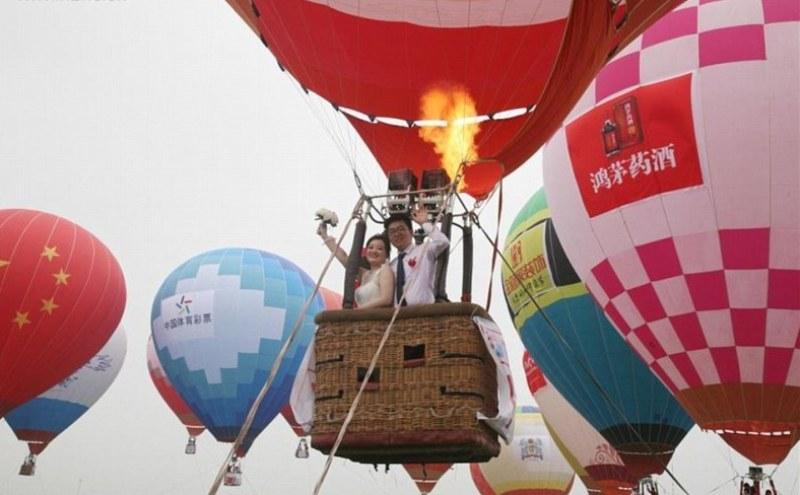 Η συμβατική εικόνα που έχουμε για την τελετή του γάμου είναι ο γαμπρός και η νύφη μαζί με τους καλεσμένους τους σε μια εκκλησία ή το δημαρχείο, έστω σε παραλία αν πρόκειται για νησί.Ωστόσο, 50 ζευγάρια Κινέζων έδωσαν άλλη έννοια στην φράση «παράξενα μέρη στα οποία μπορείτε να παντρευτείτε» καθότι επέλεξαν να παντρευτούν στον αέρα μέσα σε…αερόστατα.