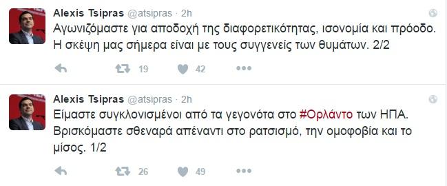Μέσα από τον προσωπικό λογαριασμό του στο Twitter ο Αλέξης Τσίπρας αναφέρθηκε στα τραγικά γεγονότα στο Ορλάντο, δηλώνοντας συγκλονισμένος. Σημειώνει ότι “βρισκόμαστε σθεναρά απέναντι στον ρατσισμό, την ομοφοβία και το μίσος” και υπογραμμίζει ότι “αγωνιζόμαστε για αποδοχή της διαφορετικότητας, ισονομία και πρόοδο”.