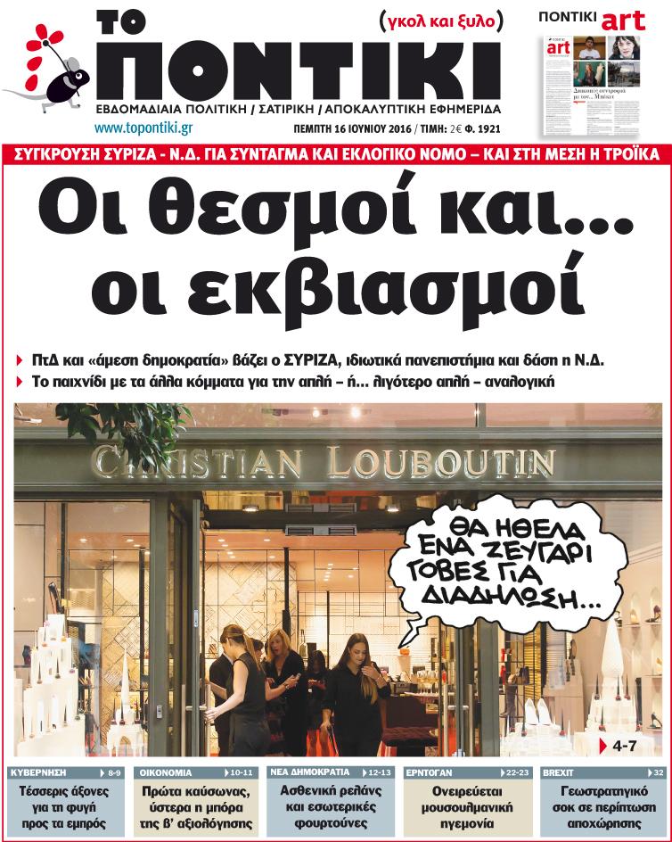 Με πρωτοσέλιδο τίτλο «Οι θεσμοί και… οι εκβιασμοί» και αναλυτικό – αποκαλυπτικό ρεπορτάζ για τη σύγκρουση μεταξύ ΣΥΡΙΖΑ-ΝΔ για το Σύνταγμα και τον εκλογικό νόμο, με τη τρόικα να είναι στη μέση. Το «Ποντίκι» κυκλοφορεί το πρωί της Πέμπτης 16 Ιουνίου.
