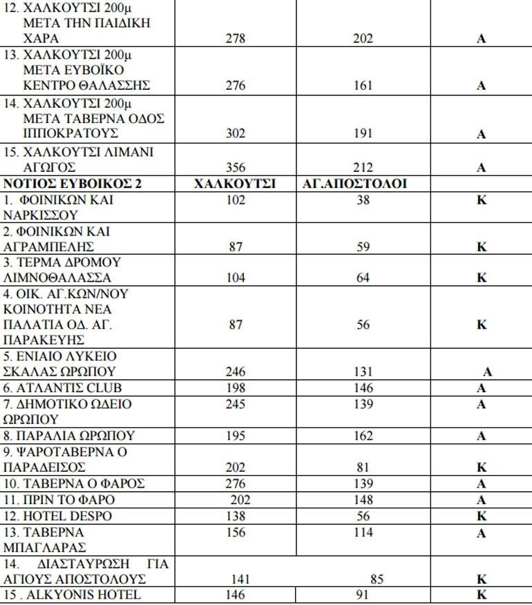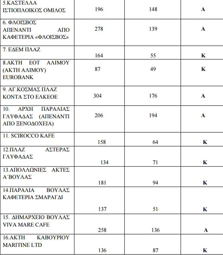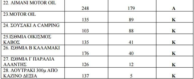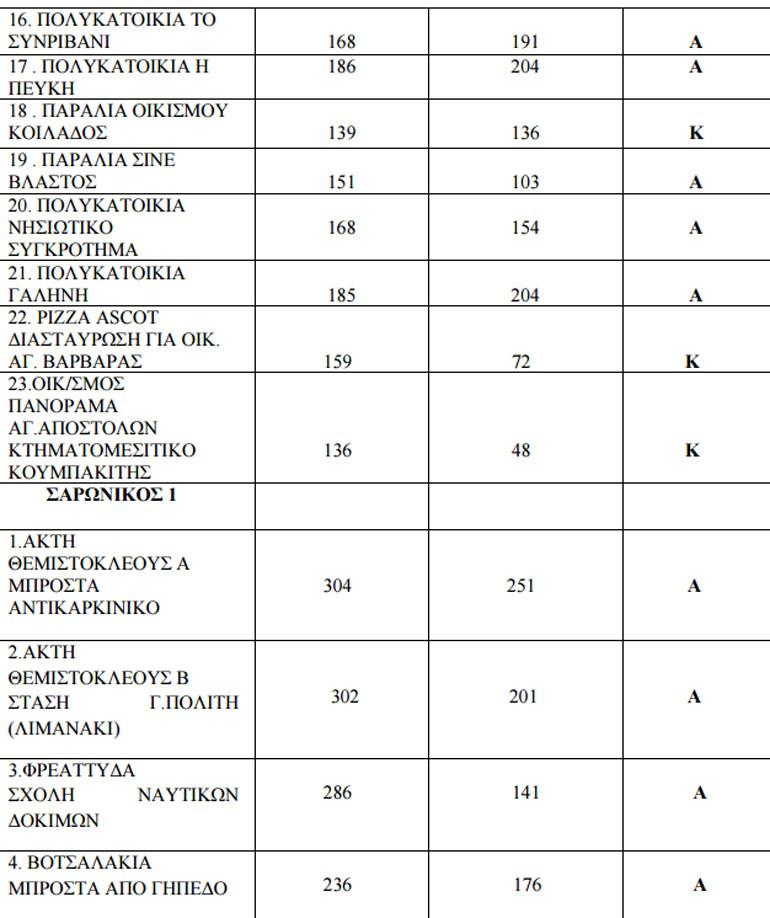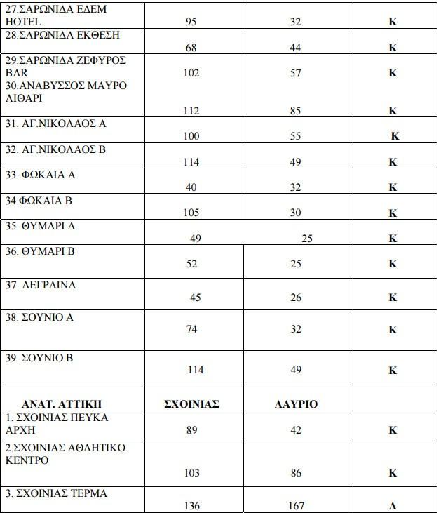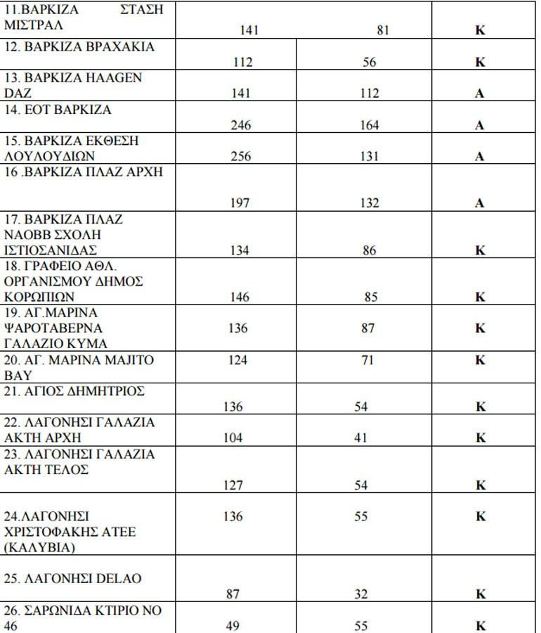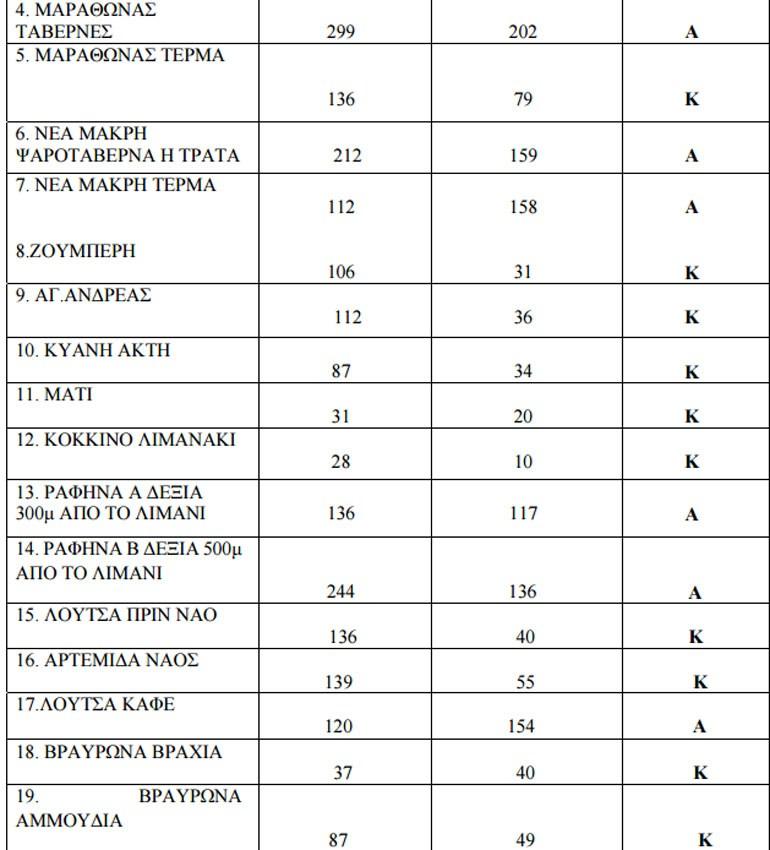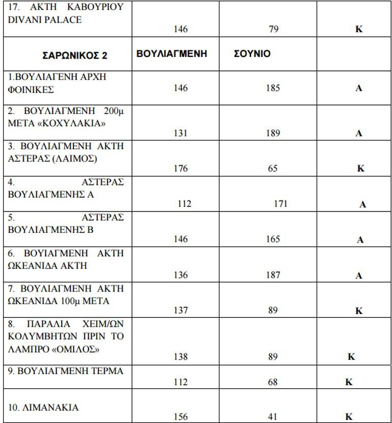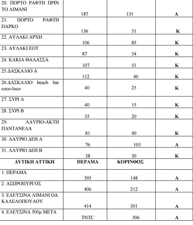Το ΠΑΚΟΕ δημιούργησε τους παρακάτω πίνακες, στους οποίους χαρακτηρίζει τις παραλίες κατάλληλες (Κ) είτε ακατάλληλες (Α) για κολύμβηση. Οι πίνακες αφορούν ακτές της Αττικής, του Ευβοϊκού και του Κορινθιακού.