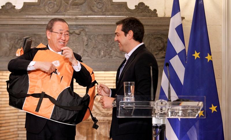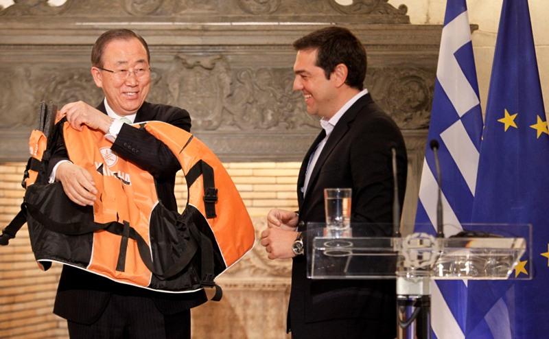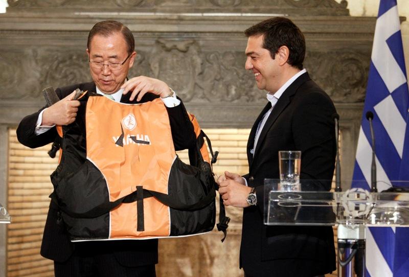 Κατά τη διάρκεια των κοινών δηλώσεων τους, ο Έλληνας πρωθυπουργός πρόσφερε στον γ.γ. του ΟΗΕ ένα πορτοκαλί σωσίβιο, σαν αυτά που χρησιμοποιούνται από τους διασώστες στις ελληνικές ακτές μετά το ξέσπασμα της προσφυγικής κρίσης.