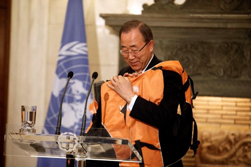 Μόλις έδωσε το πορτοκαλί σωσίβιο στον Μπαν Κι Μουν, ο γ.γ. του ΟΗΕ το φόρεσε χαμογελώντας. «Είναι ένα σημαντικό δώρο. Το χρειάζομαι. Πολλοί άλλοι πιθανόν να το χρειάζονται περισσότερο», δήλωσε, ενώ αποκάλυψε ότι δεν ξέρει κολύμπι. «Όποτε βρίσκομαι σε πλοίο, μπορεί να το χρειαστώ», συμπλήρωσε και επαίνεσε τους Έλληνες που «είστε αφοσιωμένοι στη διάσωση πολλών ανθρώπων σε δύσκολες συνθήκες».