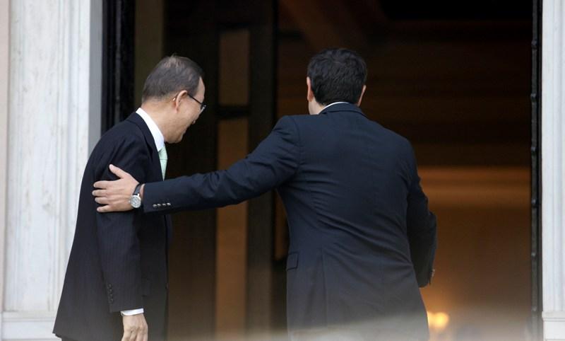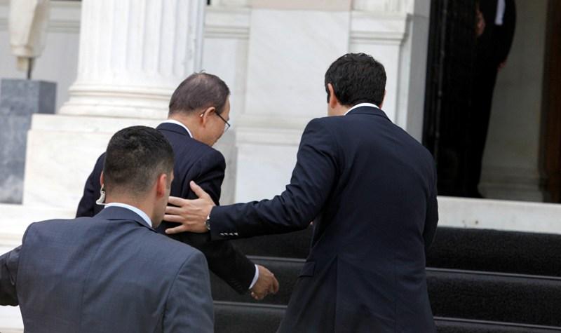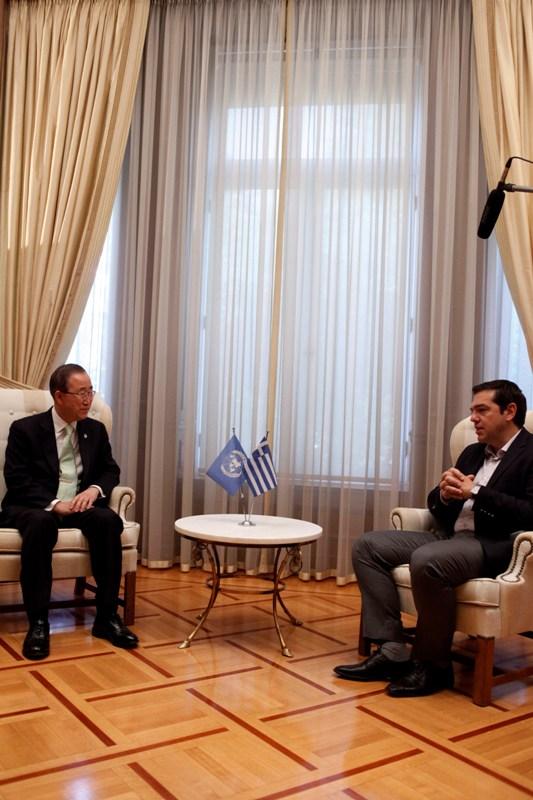 «Έρχεστε σε μια ιδιαίτερα κρίσιμη στιγμή για την ειρήνη, την σταθερότητα την ασφάλεια στην ευρύτερη περιοχή», είπε ο πρωθυπουργός Αλέξης Τσίπρας, υποδεχόμενος τον γενικό γραμματέα του ΟΗΕ, Μπαν Κι Μουν στο Μέγαρο Μαξίμου.