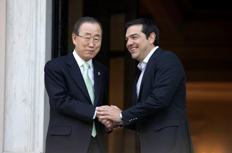 Είναι τιμή μου που βρίσκομαι για δεύτερη φορά σε αυτήν την χώρα. Είμαι εδώ για να εκφράσω την ευγνωμοσύνη μου για την προσπάθεια της Ελλάδας, για την προσπάθεια του ελληνικού λαού για την γενναιοδωρία του και για το ότι κατόρθωσε να σταθεί αρωγός σε πολλούς ανθρώπους στους οποίους έδωσε την υποστήριξή του, ανέφερε ο γενικός γραμματέας του ΟΗΕ, Μπαν Κι Μουν, στην αντιφώνησή του στον πρωθυπουργό Αλέξη Τσίπρα.