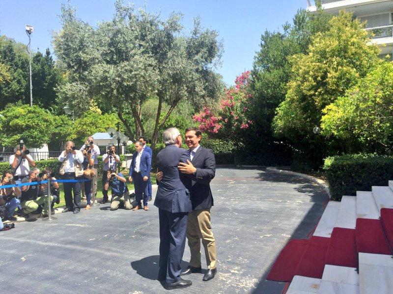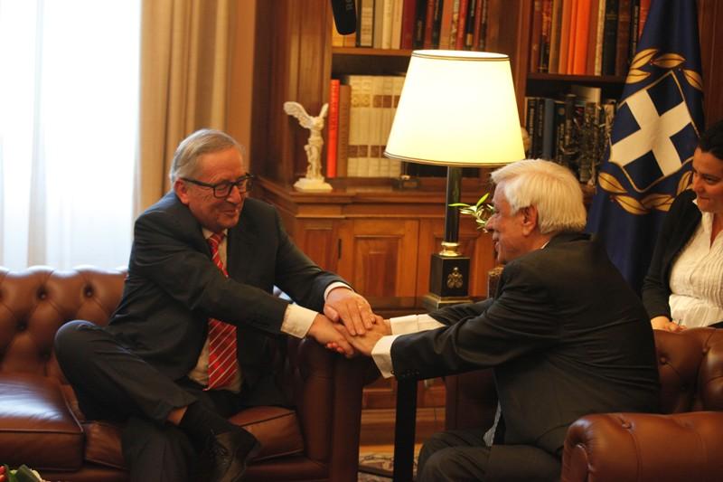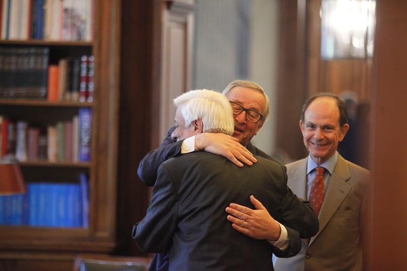 Λίγη ώρα νωρίτερα ο πρόεδρος της Κομισιόν Ζαν Κλοντ Γιούνκερ αντάλλαξε θερμές αγκαλιές με τον Πρόεδρο της Δημοκρατίας Προκόπη Παυλόπουλο στη διάρκεια της συνάντησης τους στο προεδρικό Μέγαρο.