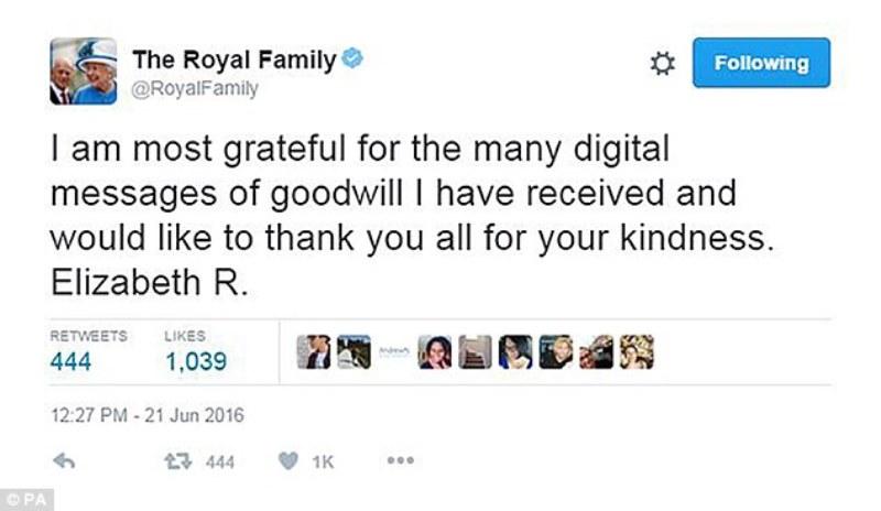 «Είμαι ευγνώμων για τις πολλές διαδικτυακές ευχές που έχω λάβει και θα ήθελα να σας ευχαριστήσω όλους για την καλοσύνη σας. Elizabeth R. »