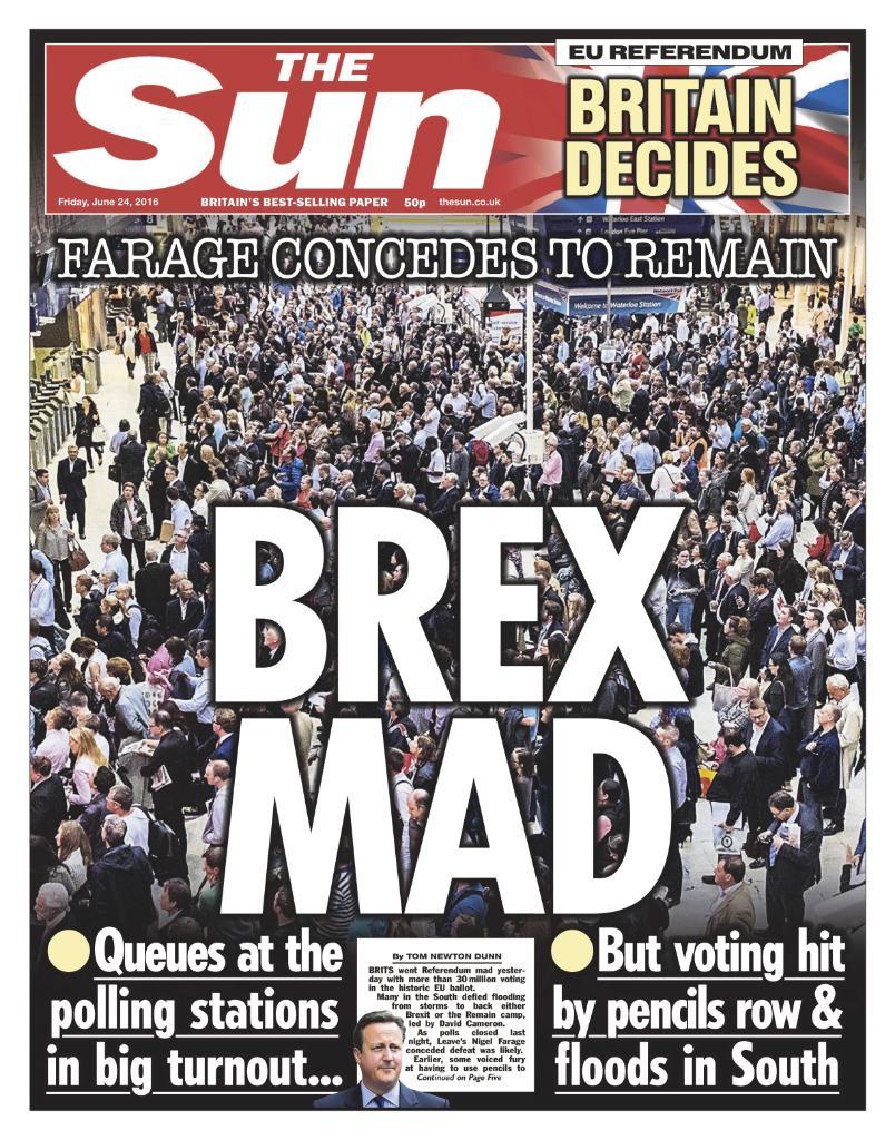Με πρωτοσέλιδο “Brex Mad” κυκλοφορεί το πρωί της Παρασκευής η Sun, η οποία είχε ταχθεί υπέρ του Brexit. Αναφέρει, μάλιστα, ότι ο Νάιτζελ Φάρατζ παραδέχεται το Remain, δηλαδή ότι η Βρετανία μένει στην ΕΕ.