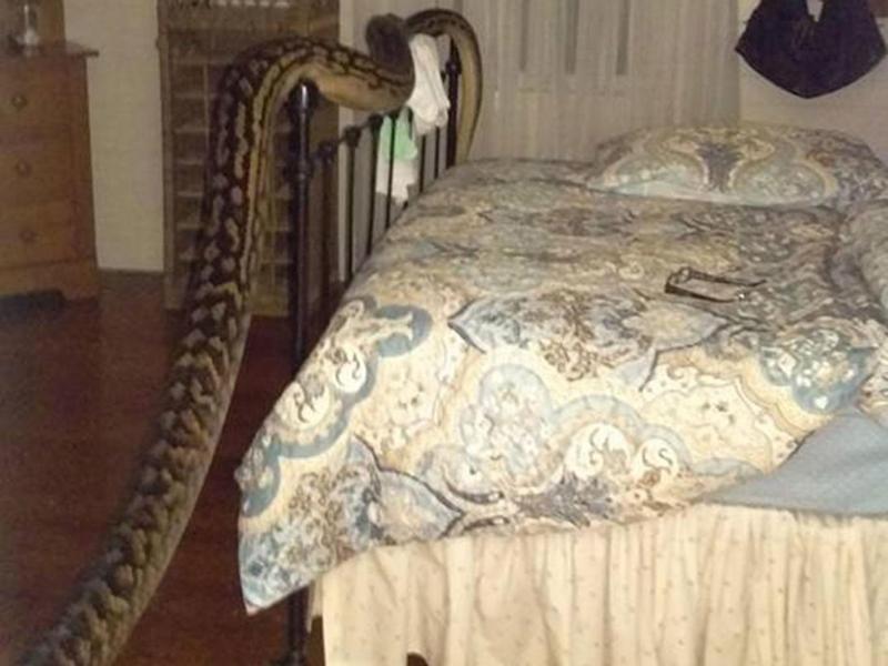 Η Τρίνα Χίμπερντ ξύπνησε το βράδυ για να πάει να πιει ένα ποτήρι νερό όταν είδε έναν τεράστιο πύθωνα της οικογένειας Morelia amethistina να κρέμεται από τους τοίχους, την κουρτίνα και τα κάγκελα του κρεβατιού της.