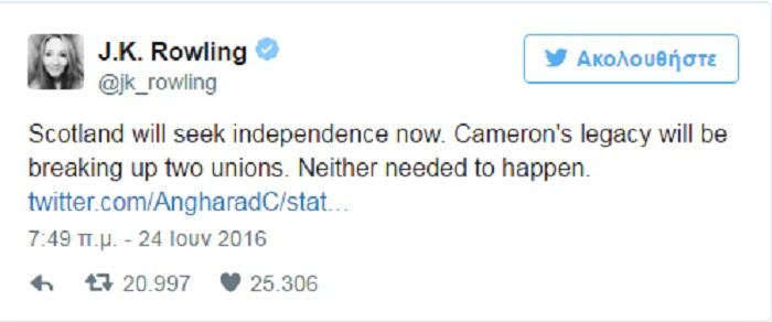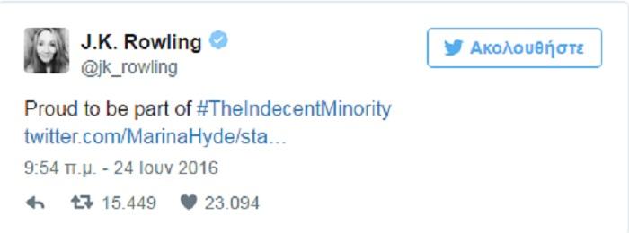 Η συγγραφέας του Χάρι Πότερ, η διάσημη J.K. Rowling, είναι εξαγριωμένη με τους συμπατριώτες της που ψήφισαν υπέρ της εξόδου και βγάζει καπνούς από τα αυτιά για τον Φάρατζ.